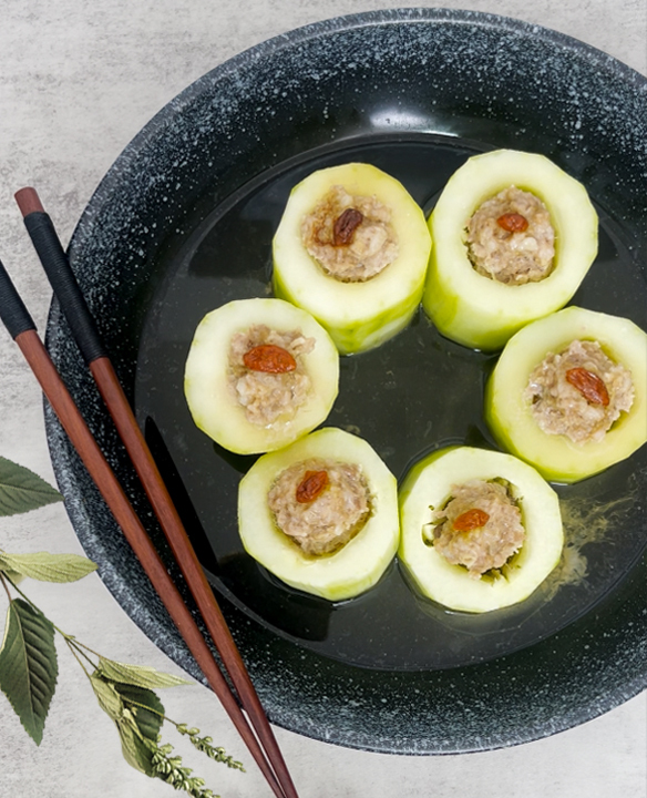 大黃瓜鑲肉是將去籽的大黃瓜段中填入調味過的肉餡,再蒸或煮熟的一道菜。做法簡單但變化多端,餡料與調味可依喜好調整。 黃瓜本身低熱量、高水分,富含維生素C與膳食纖維。絞肉提供蛋白質,也可以選用瘦肉或豆腐作為健康替代。避免油膩,可減少肥肉、用蒸煮方式製作。 而且夏天吃尤其清爽!