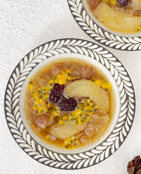 百香果水梨燉銀耳是一道清爽又養生的甜品,融合了水果的香甜與銀耳的滑嫩口感,既能補水潤燥,又帶有自然的酸甜風味,很適合夏季解暑時享用。銀耳有「平民燕窩」之稱,富含植物性膠質,口感軟糯滑嫩,滋陰潤燥又低熱量。百香果酸香濃郁,含有豐富的維生素C與香氣分子,能為整道甜品增添清新的果香。水梨汁水豐富、味道甘甜,有潤肺止咳、生津的效果,與銀耳搭配能增加甜湯的清爽感。而今天不加糖,我們只使用了桂圓和紅棗來增加甜味,既養生又低熱量。