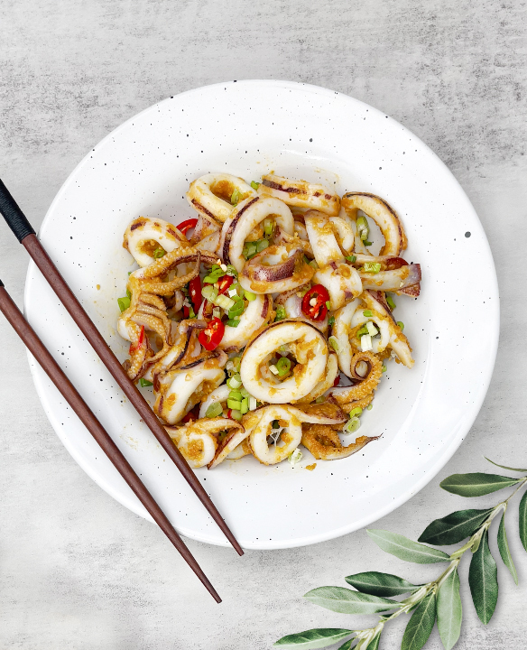 | 💡TIPS: 1.中卷汆燙後擦乾 → 避免入鍋出水,讓金沙能裹得住。 2.中火快速下中卷,拌炒均勻,讓金沙均勻裹附在中卷上。 3.火候掌握 → 中卷入鍋後不要炒太久,否則會變硬。 4.可加點椰漿→ 讓金沙更濃郁滑順,泰式風味加分 |